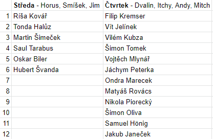 Ahoj, na základě vyplnění formuláře jsem zhotovili seznam kdo kdy chodí na schůzky. Pokud jste se nenašli na seznamu prosím pište SMS, a dořešíme detaily. Bohužel čtvrteční schůzka již plná. Ve středeční je stále místo.